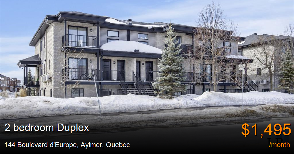 Duplex for rent in Aylmer at 144 Boulevard d'Europe. Well-maintained and professionally managed building offering a quiet, clean, and secure living environment. The property stands out for its well-kept common areas and welcoming atmosphere. Ideal for tenants looking for comfort, peace of mind, and a pleasant place to call home, whether for a couple, small family, or working professional. Located in a desirable and established area, the building enjoys a strategic location close to essential services. Grocery stores, pharmacies, schools, parks, restaurants, and local shops are all nearby. The neighborhood is well served by public transportation and provides easy access to major roads, making daily commuting simple and convenient.Located in a desirable and established area, the building enjoys a strategic location close to essential services. Grocery stores, pharmacies, schools, parks, restaurants, and local shops are all nearby. The neighborhood is well served by public transportation and provides easy access to major roads, making daily commuting simple and convenient.