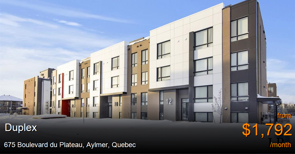 Duplex for rent in Aylmer at 675 Boulevard du Plateau. Immeuble bien entretenu et géré de façon professionnelle, offrant un environnement de vie calme, propre et sécuritaire. La propriété se distingue par ses aires communes soignées et son atmosphère accueillante. Idéal pour des locataires à la recherche de confort, de tranquillité d’esprit et d’un endroit agréable où s’établir, que ce soit pour un couple, une petite famille ou un professionnel. Situé dans un secteur recherché et bien établi, l’immeuble bénéficie d’un emplacement stratégique à proximité des services essentiels. Épiceries, pharmacies, écoles, parcs, restaurants et commerces de quartier se trouvent à quelques minutes. Le secteur est bien desservi par le transport en commun et offre un accès facile aux axes routiers principaux, rendant les déplacements quotidiens simples et pratiques.