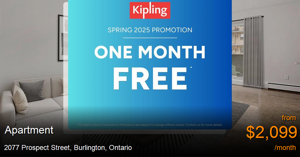 Apartment for rent in Burlington at 2077 Prospect Street. Open House on Saturday, August 16th from 10:00am - 4:30pmReceive 1 Month Free Rent!*2077 Prospect Street is located on a beautiful tree-lined street just north of downtown Burlington. This family and transit-friendly community features a collection of renovated 1 and 2-bedroom suites with modern finishes, including balconies, hardwood floors, and contemporary appliances. Residents enjoy access to a variety of convenient amenities:On-site laundry facilitiesPrivate BBQ terrace with seating and greeneryOutdoor playground for children24-hour video surveillance for added securityPet-friendly communityProfessional on-site management team2077 Prospect Street offers excellent access to public transit and major highways, making commuting simple. Optimist Park is just a 4-minute walk, Burlington GO Station is 7 minutes away, and Burlington Centre is only 5 minutes away. Shops, restaurants, waterfront trails, Lake Ontario, and downtown Burlington are all easily accessible by foot, bike, or car.*On approved lease applications. Conditions apply. Promotions are subject to change without notice. Contact us for more details.