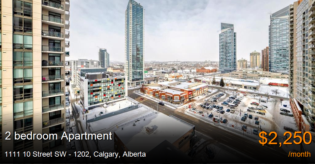 Apartment for rent in Calgary at 1111 10 Street SW - 1202. Luxury 2-Bedroom Condo with Bow River & Downtown Views Welcome to your modern urban oasis! This spacious 2-bedroom, 2-bathroom condo offers nearly 1,000 sq. ft. of luxury living, featuring spectacular views of the Bow River and downtown. Whether you're unwinding on the large balcony or enjoying the high-end finishes inside, this condo is designed for comfort and convenience. Unit Features: Kitchen: Large kitchen with stainless steel appliances, including a fridge, oven, stove, dishwasher, and a natural gas range. Ample cupboard space and an open layout, perfect for cooking and entertaining. Living Space: Spacious, open-concept design with floor-to-ceiling windows in the living room and both bedrooms, providing abundant natural light and breathtaking views. Expansive private balcony with stunning views of the Bow River and downtown skyline. Bedrooms & Storage: Two generously sized bedrooms, both featuring floor-to-ceiling windows and ample closet space. Walk-through closet in the primary bedroom leading to a private ensuite. In-unit laundry and a flex room for extra storage or use as a home office. A mix of carpet and tile flooring for comfort and durability. Parking: Heated underground parking stall, conveniently located near the elevator for easy access. Building Features: Reinforced concrete construction for superior soundproofing. Secure building access with individual floor security and heated visitor parking. Onsite concierge for added convenience. Amenities: Recently renovated gym with modern equipment, steam rooms, and a yoga studio. Spacious lounge area with a TV, pool table, kitchenette, and a sunny patio. Secure bike room and guest suites available for visiting family and friends. Prime Location: Just steps from 17th Avenue SW – home to top-rated restaurants, nightlife, and entertainment. Parks & Outdoor Recreation – Easy access to river pathways, parks, and green spaces. Shopping Convenience – Three grocery stores nearby, including Co-op across the street. Easy Commuting: 5-minute walk to the C-Train station for quick downtown access. Multiple bus routes right outside, connecting to Foothills Hospital, UofC, Westhills, and Marda Loop. This condo combines modern luxury, unbeatable convenience, and breathtaking views for the ultimate city living experience. Schedule your viewing today!