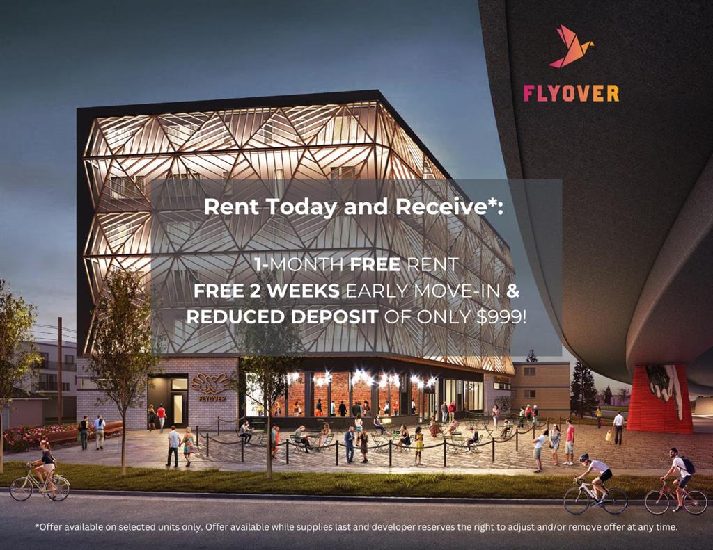 Discover the reasons to live at Flyover - Units starting from $1,199/month!! Now with our exclusive tenant Coffee Room, Flyover360 Sky Lounge, Coworking Space, Community Garden, Rooftop Games Area! NOW 97% LEASED!Located steps away from downtown, Flyover embodies Bridgeland-living at its finest. With close proximity to East Village, the Bow River and the city’s internationally-acclaimed Flyover Park, Flyover is more than just a building. It’s the perfect hub for your daily activities, the ideal basecamp for your busy life. Flyover is only minutes away from the best restaurants, cafes and night life Calgary has to offer. From the ultra-modern aesthetic to the iconic 50-foot artist’s mural that adorns it, Flyover is redefining how it feels to live and work in the heart of the city. Choose Flyover, and you’re choosing a property you’ll be proud to call home.