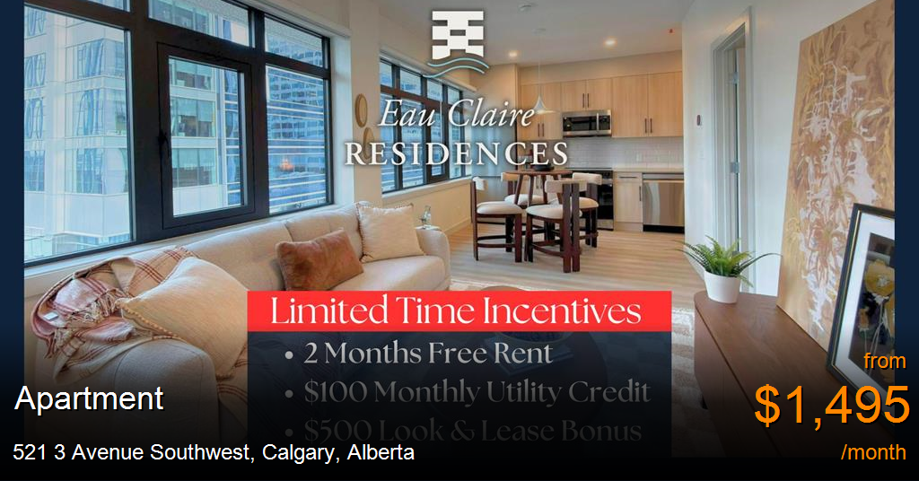 Apartment for rent in Calgary at 521 3 Avenue Southwest. Eau Claire Residences is now pre-leasing stunning new suites in downtown Calgary — and for a limited time, new residents can enjoy exceptional move-in incentives designed to welcome you home.