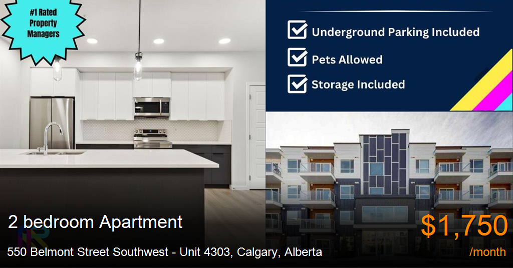 Apartment for rent in Calgary at 550 Belmont Street Southwest - Unit 4303. Modern 2 Beds, 2 Baths Apartment/Condo | 1 Pet Allowed. 20lbs Max | $1850/month on 18 month lease or $1900/month on 1 year lease