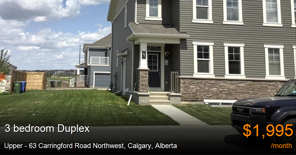Duplex for rent in Calgary at Upper - 63 Carringford Road Northwest. Welcome to your new home in the vibrant and growing community of Carrington. This beautifully designed, never-lived-in upper unit duplex offers modern living in a family-friendly neighborhood with every convenience at your doorstep.