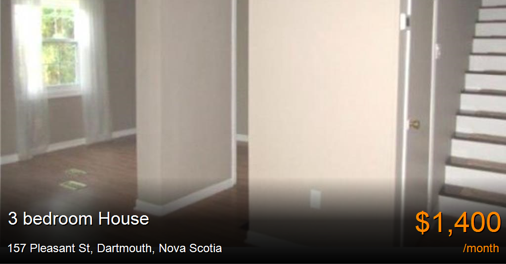 House for rent in Dartmouth at 157 Pleasant St. Spacious 3 bedroom semi-detached home in lovely Dartmouth location on Pleasant St. within walking distance to Ferry Terminal, shops, restaurants, and Harbourfront Boardwalk.Large living and dining room with laminate flooring.Eat in kitchen with door to back patio overlooking lovely private back garden.3 bedrooms upstairs. One full bathroom.Utilities extra. 5 appliances included. Unfinished basement for storage.No dogs. Non smoking.Available April 1 on a yearly lease.