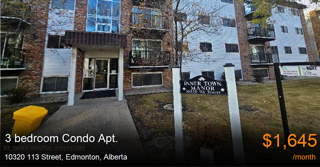 This Beautiful 3-bedroom Apartment, 1.5 baths on the 3rd floor, comes with 2 Air-conditioning sets. The living room and primary rooms are large. The unit boasts of approx. 1,023.66 sq ft. This apartment complex is ideally located right in the heart of downtown Edmonton. Major roads nearby are 109th St and 104 Ave., with easy access to Jasper Ave. Close to shopping, schools, transportation, and walking trails.