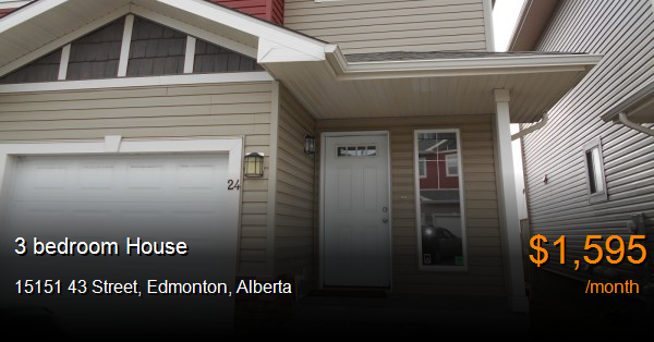 House for rent in Edmonton at 15151 43 Street. Magnificent Home in Miller Park Estates! Walk into this beautiful 3 bedroom 2.5 bath Half Duplex and find a spacious entryway, a main floor bathroom and ceramic tile greet you. Laminate flooring leads you through the fabulous open floor plan; Perfect for entertaining family and friends. An upgraded kitchen complete with granite counters, spacious island with eating bar, walk in corner pantry, and espresso cabinets will make you feel like a real chef! The dining area & living room complete this level along with a gas fireplace with beautiful stone accents! Upstairs you will find a spacious master suite complete with an en-suite bath & walk in closet. The 2 other bedrooms are also good sizes and don't forget the upstairs laundry located in the main bathroom for your convenience! This wonderful home has a single attached garage for those cold mornings so you don't have to scrap windshields.***Due to the high volume of calls we receive, please send your inquiry via email for a much quicker response. For general inquires, to view other available properties or to fill out our online rental application please visit us online at www.RentAlberta.info
