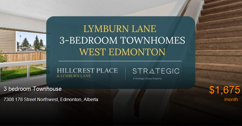 Townhouse for rent in Edmonton at 7308 178 Street Northwest. Lymburn Lane TownhomesThese bright, spacious 3-bedroom townhomes for rent offer the perfect blend of privacy, style, and modern living - ideal for families, professionals, and anyone who loves extra space.
