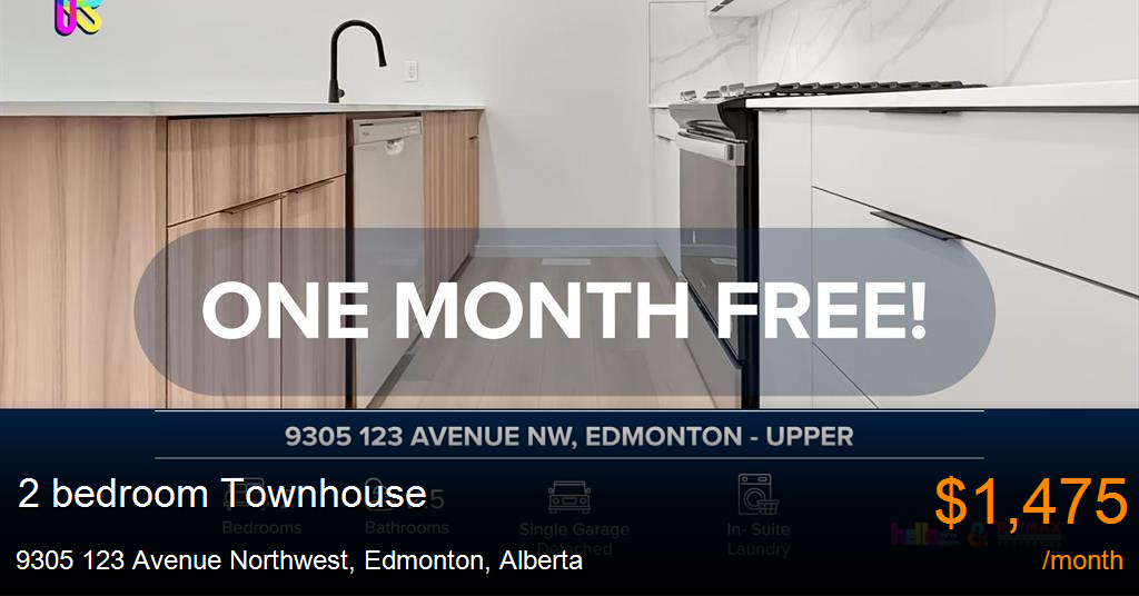 Townhouse for rent in Edmonton at 9305 123 Avenue Northwest. Modern 2 Beds, 2.5 Baths Main Floor/ Upper | No Pets Allowed | FIRST MONTH FREE IF MOVE-IN BY Jan 15/26
