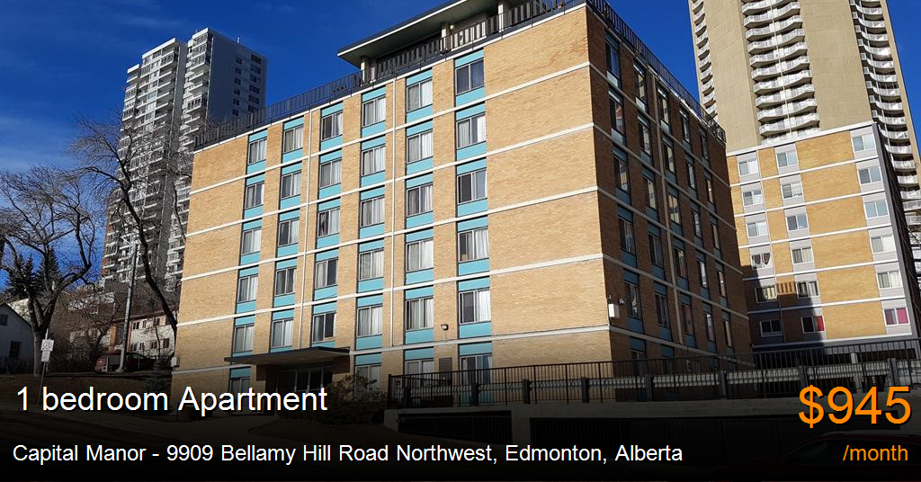 Apartment for rent in Edmonton at Capital Manor - 9909 Bellamy Hill Road Northwest. Capital Manor is located right off Bellamy Hill Road on the outskirts of Downtown Edmonton. Suites offer great views of the Legislature, Remax Field, Walterdale Bridge, and the North Saskatchewan River. There are lots of great walking trails, cafes, and parks nearby. The location of the building offers a good balance if you want to live downtown without all the noise and foot traffic that comes with it.