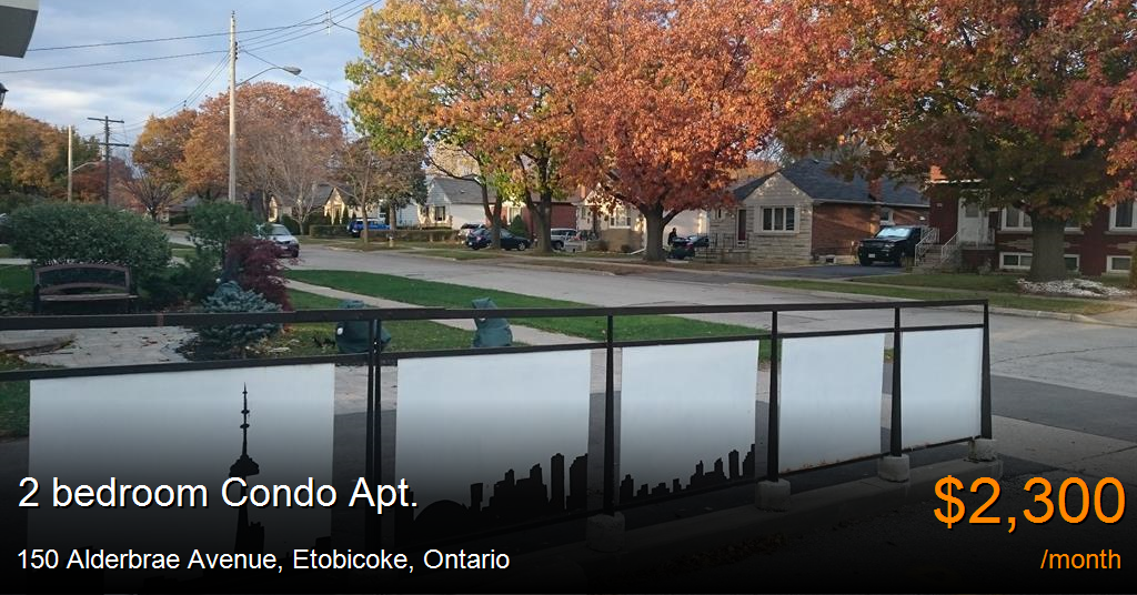Condo Apt. for rent in Etobicoke at 150 Alderbrae Avenue. Lovely, freshly renovated two bedrooms apartment with large kitchen. TTC bus stops just across the street. Coin laundry is in the building. Apartment could be furnished, WiFi and parking are available.