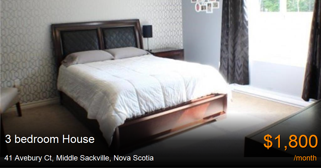 House for rent in Middle Sackville at 41 Avebury Ct. Welcoming, 3 bedroom, open concept home in Sunset Ridge on quiet cul-de-sac.Gorgeous dark hardwood flooring gives this home a rich, warm feeling.Large kitchen with lots of cabinetry opens to large dining area with doors to sundeck.Spacious and bright living area.Powder room and plenty of hidden storage also on main floor.Upper level has three bedrooms, full bath, laundry room, two linen cupboards and master bedroom with ensuite and large walk-in closet.Basement has family rec room (which could be used as a 4th bedroom), half bath, storage and entrance to attached garage.Two ductless mini split heat pumps provide economic heating and cooling year-round.A well-behaved pet may be considered. Non-smokers.Available immediately on a yearly lease.