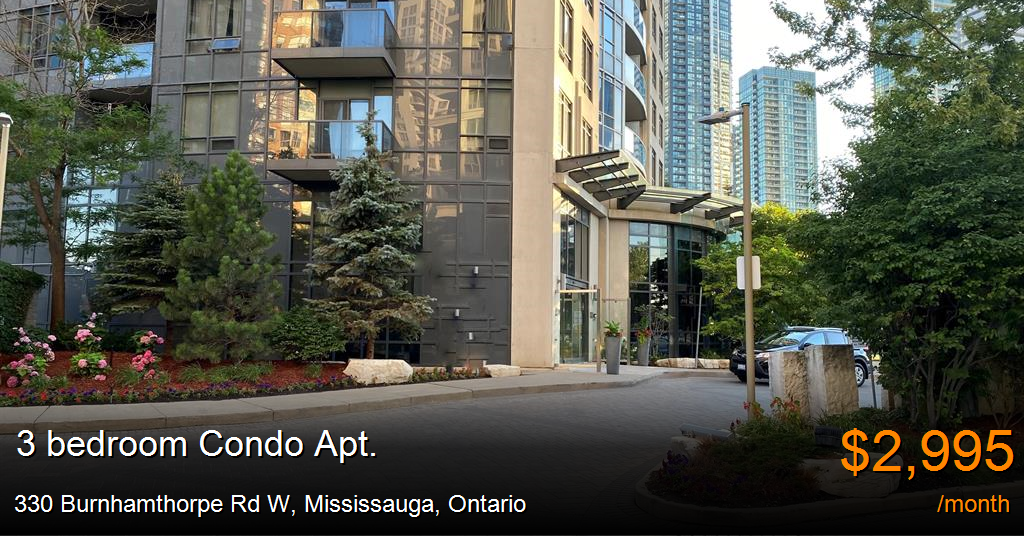 Condo Apt. for rent in Mississauga at 330 Burnhamthorpe Rd W. Large 1100 sq ft. 2BRM + Large Den Condo, 2 Bath, Square One. 1 balcony and additional HUGE terrace with unobstructed endless views!