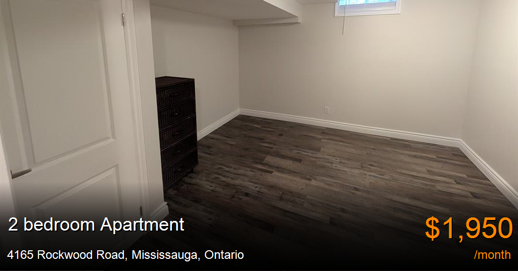 Apartment for rent in Mississauga at 4165 Rockwood Road. 2 bedroom basement apartment approximately 1200 square feet over 2 floors of space. Located at Dixie & Burnhamthorpe in Mississauga. This newly renovated Non-Smoking, air conditioned apartment features hardwood floors and tiles, shared laundry room and all utilities and internet included. 1 Parking spot is inluded. It is very close to public transit and schools, parks, shopping and all major highways. Pets are NOT permitted.