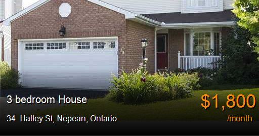 House for rent in Nepean at 34 Halley St. Unique custom home with OVERSIZED pie shaped lot on a quiet COURT! Very PRIVATE LOCATION, in a residential neighbourhood without front neighbours and a large FENCED backyard. Gleaming HARDWOOD on main level, invitingwood burning FIREPLACE in MAIN FLOOR family room. Giant master en-suite with spa like finishes. Great SCHOOLS.