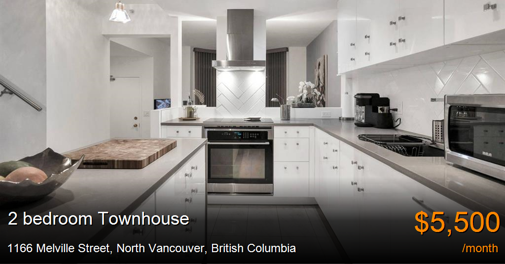 Townhouse for rent in North Vancouver at 1166 Melville Street. Welcome to Orca Place! This fully FURNISHED 2 bed, 2 bath townhouse is 1054 sq feet. Featuring 2 patios, a gorgeous gourmet kitchen with quartz countertops and high ceilings. Guests will haven access to the buildings amenities including indoor pool & hot tub, fitness centre and sauna. Your rent includes gas, hot water, heat, 1 underground parking and 1 storage locker. A minimum one month rental is required and a $200 strata move-in fee applies. Pets may be considered.