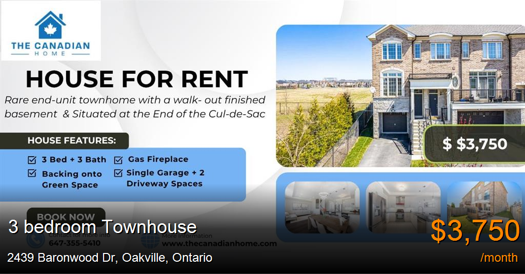 Townhouse for rent in Oakville at 2439 Baronwood Dr. Rare end-unit townhome with a walk- out finished basement, on an oversized pie-shaped lot in prestigious Westmount ! Backing onto green space & Situated at the End of the Cul-de-Sac with no neighbors on the side, This 3 bed, 3 bath home offers 2,100+ sq. ft. of upgraded living space. Features include 9' ceilings, Hardwood Floors Throughout, gas fireplace, white kitchen with gas stove, pantry, Granite countertop, and a walkout finished basement. Freshly painted , quartz countertop in both washrooms ( 2025). Attached garage + 2 driveway spaces. Just steps to coffee shops, parks, amenities, and highly rated schools. It's an absolute showstopper and a must-see!