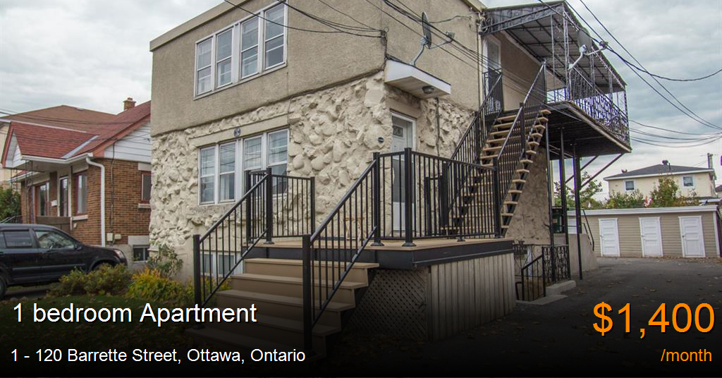 Apartment for rent in Ottawa at 1 - 120 Barrette Street. ALL INCLUSIVE! This lovely 2 bedroom unit features a spacious living room and open concept kitchen with great counter and cabinet space. Hardwood floors throughout. Great size bedrooms with closet space. Updated bathroom with tub.