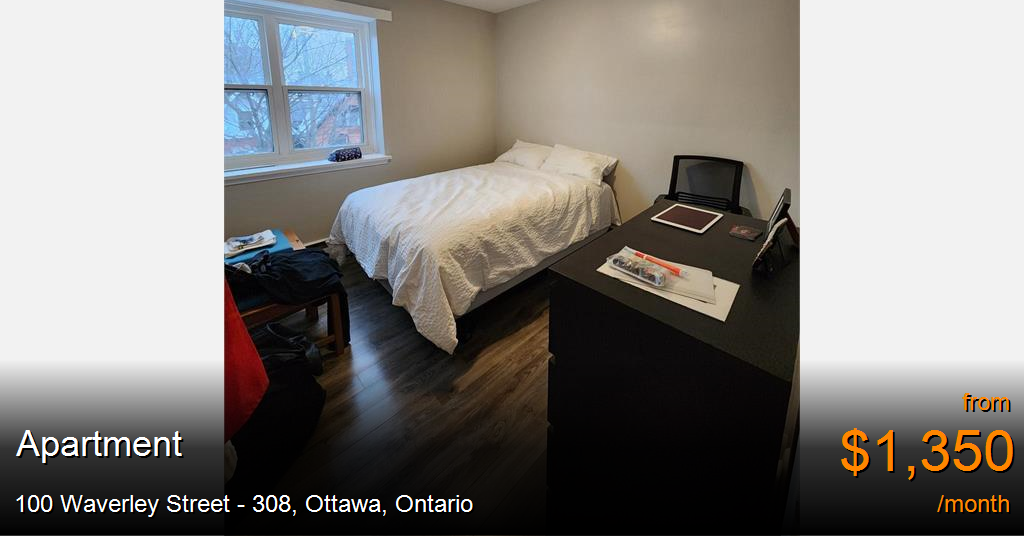 Apartment for rent in Ottawa at 100 Waverley Street - 308. Amazing location! Close to OttawaU and Elgin street, this 1 bedroom unit offers a nice entryway with a great closet, living area, bathroom with tub, a nice kitchen with stove and fridge and a lovely bedroom with great closet space and great sunlight.