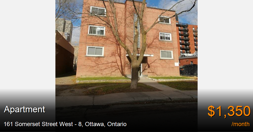 Apartment for rent in Ottawa at 161 Somerset Street West - 8. Sunny and spacious studio steps from Elgin Street. The unit offers an open style kitchen with an oven, stove and fridge, and a massive studio space with a closet, great sized bathroom with fun colored tiles also including a bathtub. There is coin laundry and storage available in the basement. There is NO parking available. Tenants are responsible for paying hydro. Welcome to 161 Somerset Street West. This low rise apartment building offers an amazing location; walking distance to Rideau mall, Elgin street, the canal, and Lansdowne. This is a quiet, yet lively neighborhood filled with many adventures.