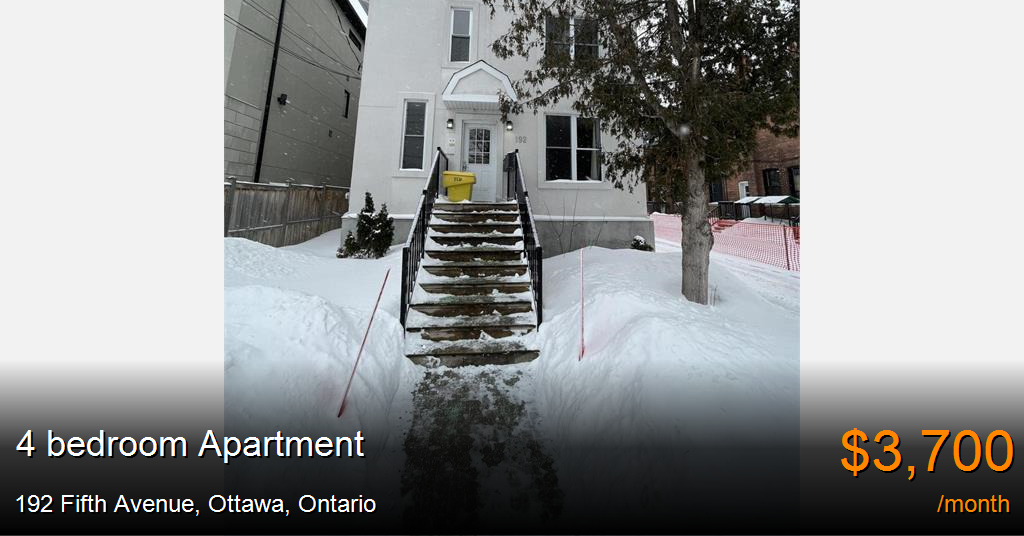 Apartment for rent in Ottawa at 192 Fifth Avenue. This spacious 4 bedroom, 2 bathroom apartment boasts ample living space and modern amenities. As you enter the apartment, you'll be greeted by an open-concept living and dining area. The living room is spacious and comfortable, perfect for relaxing after a long day, while the kitchen island provides a great space for roommate meals and entertaining guests.