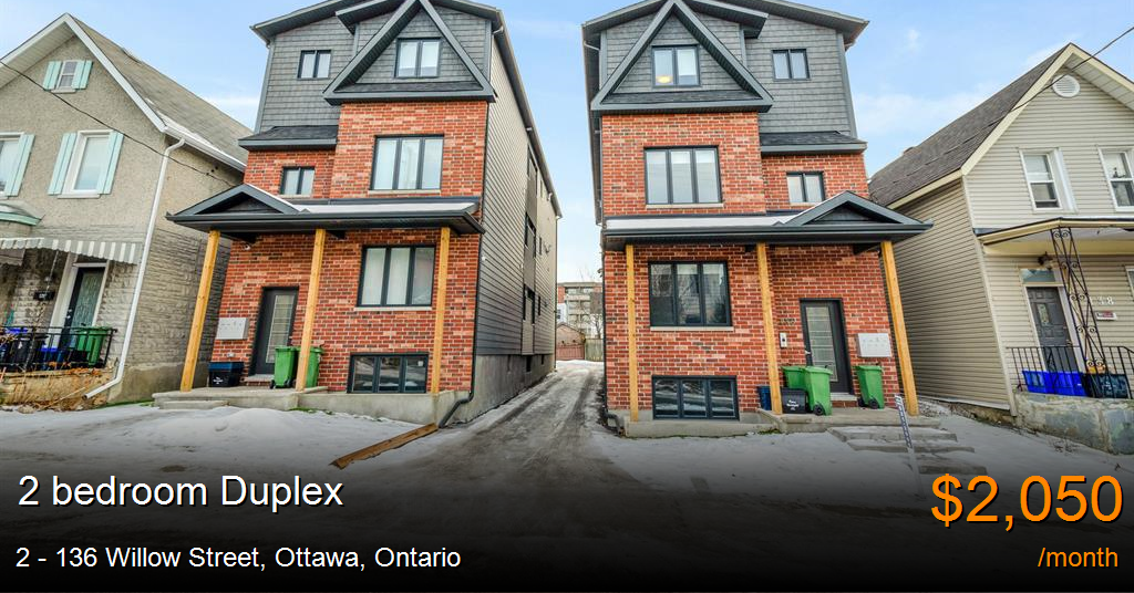 Duplex for rent in Ottawa at 2 - 136 Willow Street. Stunning 2 bed, 2 bath unit with luxury finishes!Modern kitchen complete with stainless steel appliancesOpen concept living areaLarge master bedroom with en suite bathroomHardwood flooring throughoutEn suite laundry