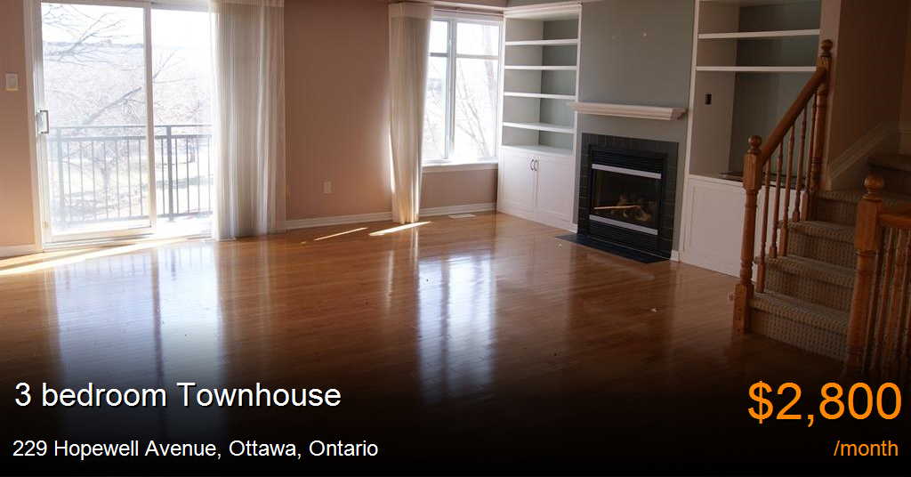 Townhouse for rent in Ottawa at 229 Hopewell Avenue. ***This gorgeous 3 bed 3 bath offers a modern yet cozy feel feel hardwood in the common areas, and carpet in the bedrooms. There are 3 levels; the first floor offering the kitchen the second living space with a balcony, and the top floor offering the bedrooms. This home has a welcoming entrance with a front patio, and a garage at the back end of the house. Tenants pay hydro, gas (heat and hot water) as well as hot water tank rental