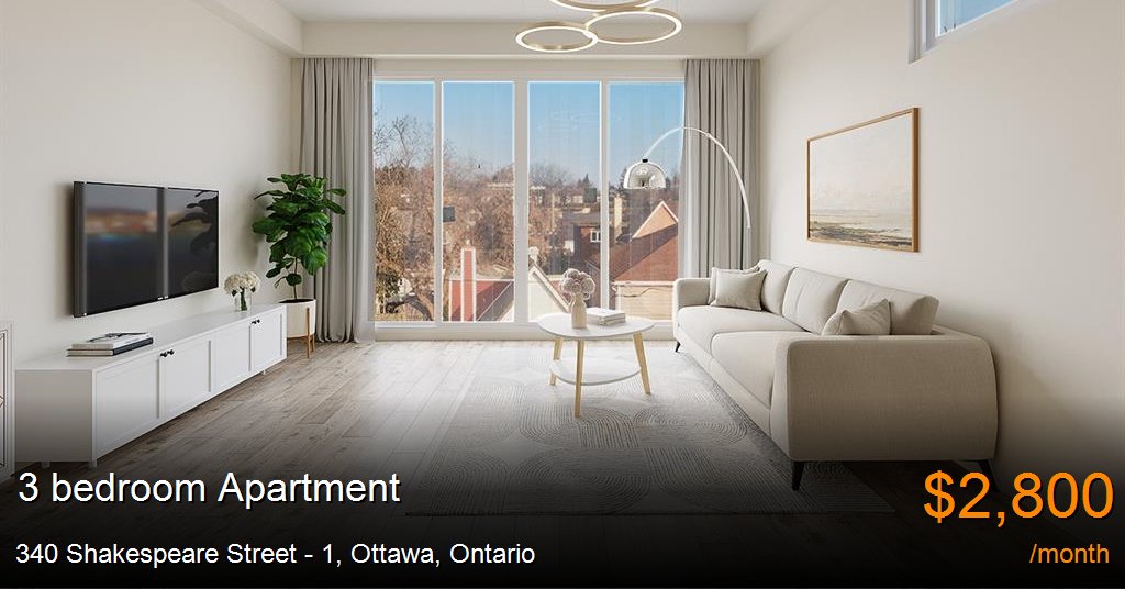 Apartment for rent in Ottawa at 340 Shakespeare Street - 1. Brand new, centrally located, luxury units for rent! These 3 bedrooms, 2 full bathroom will be ready February 1st. Open concept kitchen and living space. LVP floors throughout. The kitchen offers SS appliances and a large island with gorgeous finishes and quartz countertops. Floor to ceiling windows with a balcony off the living room. Great size bedrooms. The master bedroom offers an ensuite bathroom with large walk in shower and two great size closet space. The other bathroom offers a soaker tub. Ensuite laundry.