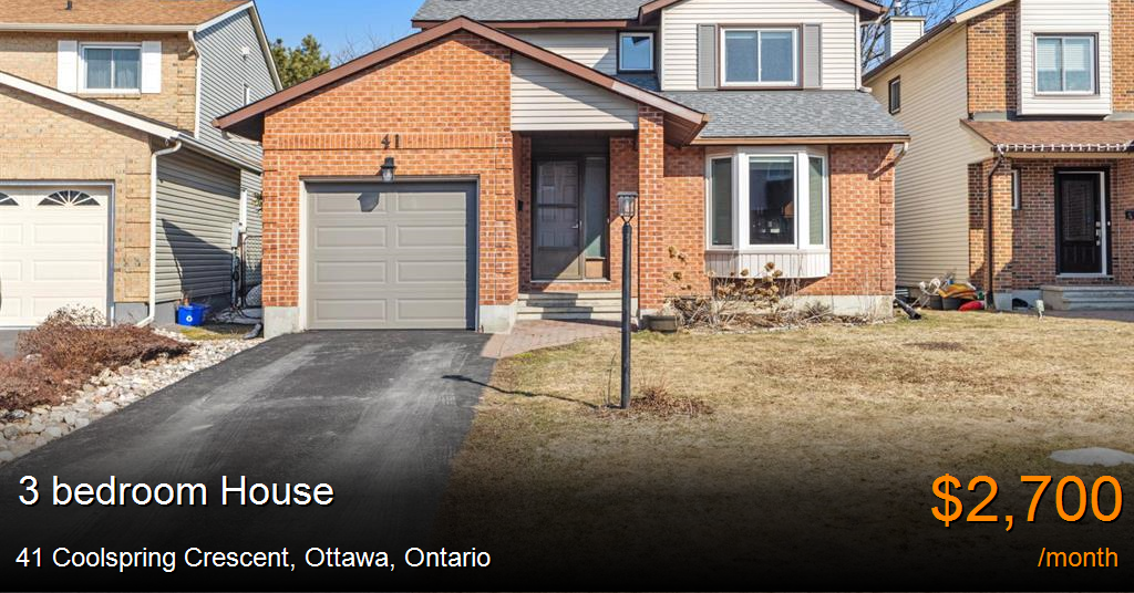 House for rent in Ottawa at 41 Coolspring Crescent. Stunning 3 bedroom, 1.5 bathroom single family home for rent in Nepean. This home comes with a gorgeous kitchen with tons of counter and cupboard space. The kitchen also offers SS Appliances. Hardwood floors throughout the main floor. Beautiful dinning room and spacious living area with a fireplace. The upper unit offers 3 great size bedrooms. The master bedroom has an ensuite bathroom and walk in closer. Unfinished basement. Large fenced backyard. Attached garageUtilities Extra