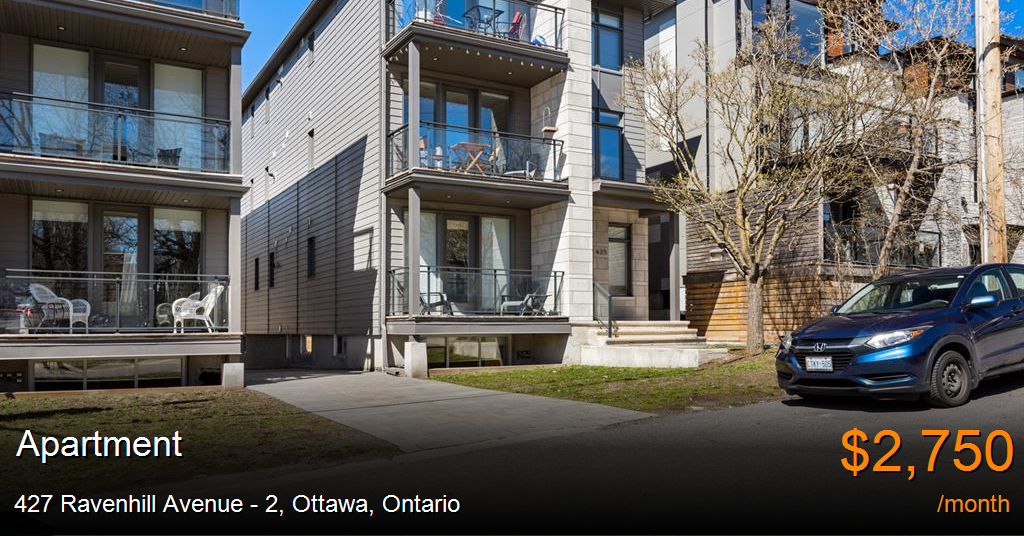 Apartment for rent in Ottawa at 427 Ravenhill Avenue - 2. Stunning 2 bedroom, 2 bathroom located in Westboro! Very bright and spacious! Large living space with a walk out balcony. Amazing size kitchen with island. Stainless steel appliances including a gas stove. Lots of cupboard space and open concept living and kitchen. Two amazing size bedroom withs lots of closet space. First bathroom offers lots of storage and a tub. Very bright master bedroom. The ensuite bathroom offers a stand up shower and again, lots of storage. Hardwood floors and pot lights throughout.