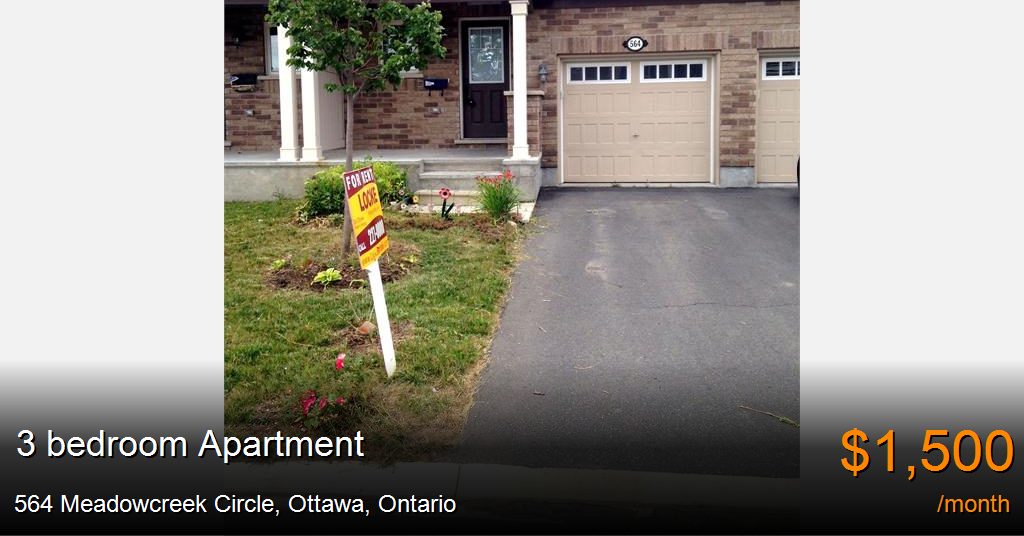 Apartment for rent in Ottawa at 564 Meadowcreek Circle. Monahan Landing. Townhouse for rent with 3 bedrooms, 2.5 bathrooms and 1 den. It boasts a sunny open concept living/dining room with gleaming hardwood floors. Eat-in kitchen with plenty of cupboards and counter tops, stainless steel fridge, stove, dishwasher and breakfast bar. Patio doors lead to a partially fenced backyard with no rear neighbors. Master bedroom is spacious with walk-in closet and ensuite. Secondary bedrooms are of good size. Basement is perfect for storage. Washer and Dryer included. Single Car Garage. Family oriented neighborhood close to schools, shopping, parks and transit with tennis courts in back! FLEXIBLE OCCUPANCY!