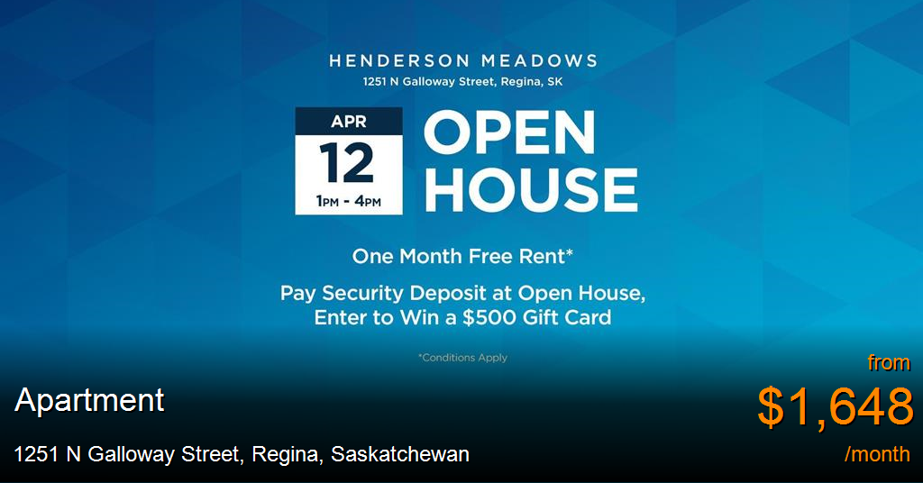 Apartment for rent in Regina at 1251 N Galloway Street. Broadstreet's Henderson Meadows offers 1, 2, and 3 bedroom pet friendly apartments for rent in the community of Hawkstone in Regina. This modern rental apartment community is perfectly situated on the northwest edge of the city, and nearby the major roadways of Rochdale Boulevard and Highway 11. The property's premier location puts the best of Regina shopping, dining, and entertainment at your doorstep. It sits in walking distance to Walmart, Home Depot, Sobeys, and Superstore, as well as on a major bus route with access to downtown.