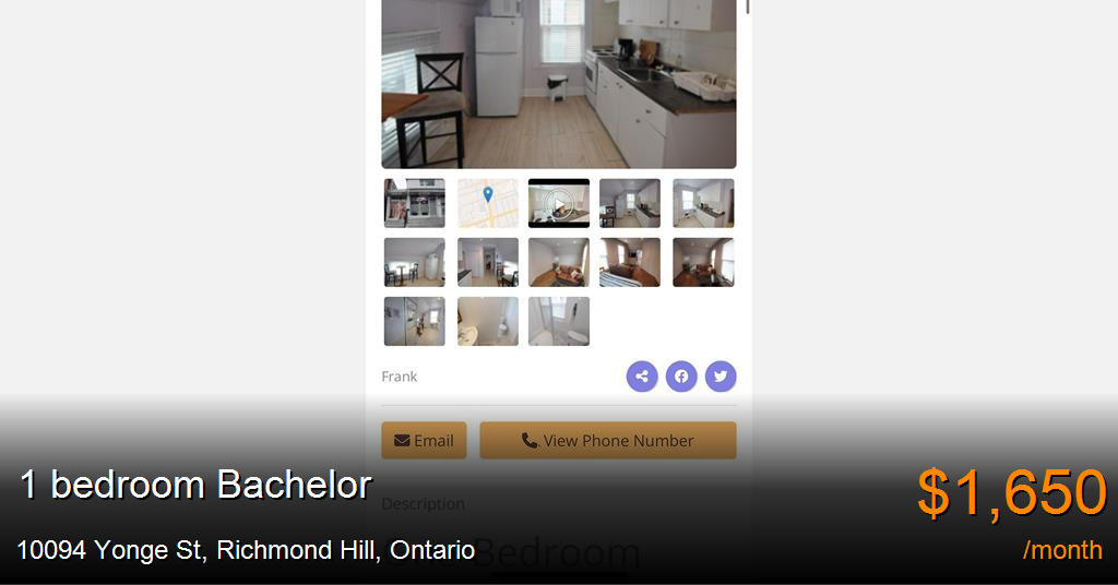 Bachelor for rent in Richmond Hill at 10094 Yonge St. One-Bedroom Apartment – $1,650 + partial utilities