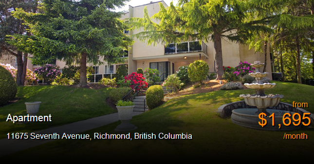Apartment for rent in Richmond at 11675 Seventh Avenue. Amenities include:Ask about our furnished suites, Indoor and Outdoor Parking, Lockers, Party Room, Fitness Room, Sauna, Elevators, Onsite office, Balconies, Laundry Room, Outdoor Swimming Pool, Courtyard with Fish Pond, Canada Post parcel lockers available, Walk Score of 60, Lord Byng Elementary , Shia Muslim Community Ctr , Pajo's Fish & Chip , Caesar's Grill & Restaurant , Super Grocer , British Home Store , Steps from Robert Alexander Secondary School, Minutes drive from Steveston Community Centre