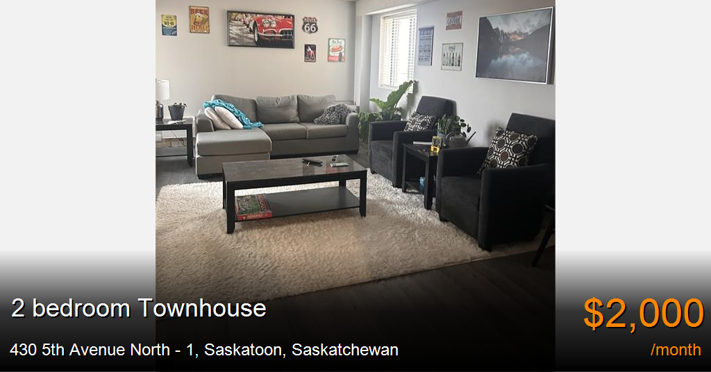 Townhouse for rent in Saskatoon at 430 5th Avenue North - 1. AIR CONDITIONING 2 Bedroom Condo in Downtown Saskatoon – Available December 1, 2025