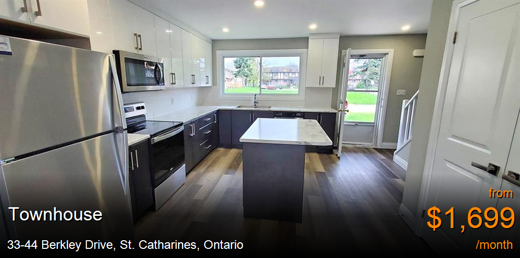 Townhouse for rent in St. Catharines at 33-44 Berkley Drive. Welcome to our exquisite townhomes at 33 and 44 Berkley Drive. Situated in the north end of St Catharines in a beautifully maintained neighbourhood, this townhouse complex is literally seconds away from major shopping areas, beaches, as well as highway access. Managed by the on-site staff as well as our head office in Niagara Falls, you can enjoy luxurious and comfortable rental living in beautifully renovated 2 & 3 king-sized bedroom suites.