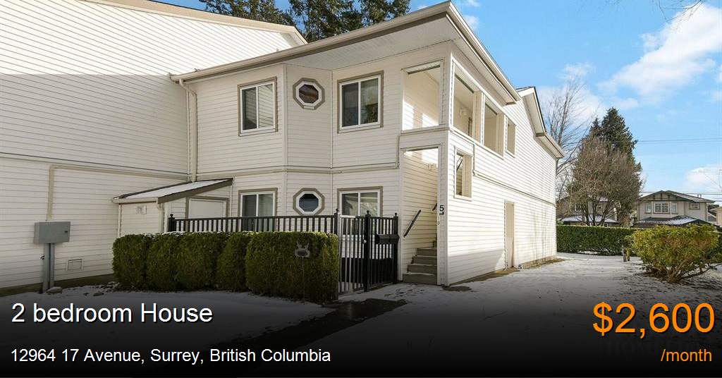 House for rent in Surrey at 12964 17 Avenue. Discover the charm of coastal living in this spacious 2-bedroom, 2-bathroom townhouse in the sought-after Ocean Park Village complex. Conveniently located next to Ocean Park Shopping Centre, you'll have easy access to Safeway, cafes, restaurants, and the Surrey Libraries – Ocean Park Branch. This home offers a prime location in a vibrant community, with shopping, dining, and everyday conveniences just steps away.