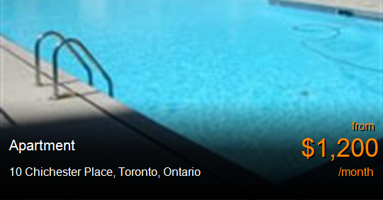 Apartment for rent in Toronto at 10 Chichester Place. This quality 17 storey hi-rise building offers you many conveniences. Local area amenities include the Consumer's Road business district, grocery stores, coffee shops, restaurants, parks, and schools. We are located close to both the 401 and the Don Valley Parkway. There is a TTC bus stop outside the building that runs right to the new Don Mills Subway station. Fairview Mall, with its movie theatres, numerous shops, and quality restaurants is just a short drive or bus ride away. Our rental office is located on site at 10 Chichester Place. Three elevators, basement laundry facility, outdoor pool and sundeck, security cameras, on site super intendents, new carpet in common areas, balconies and main floor walkouts from some units, cable ready, parquet flooring, controlled access, new appliances