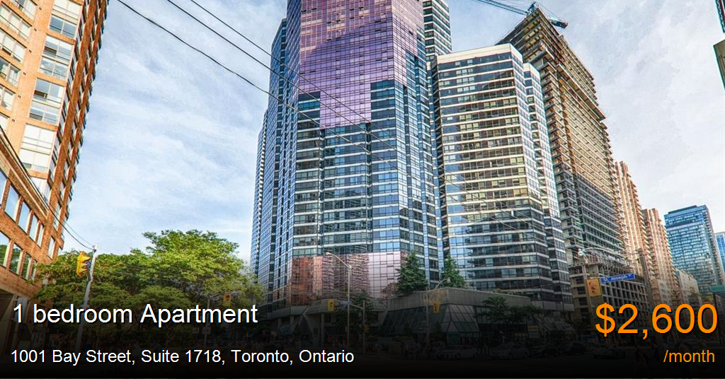 Apartment for rent in Toronto at 1001 Bay Street, Suite 1718. Prime Location! 1 Bedroom + Solarium, Centrally Located And In Pristine Condition. Conveniently Located To Subway, Shops, Museums, Hospital.