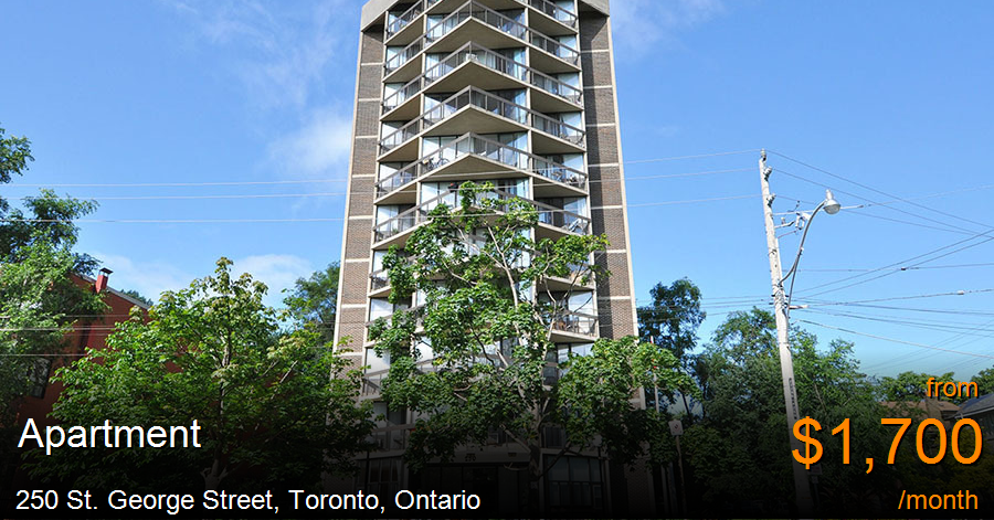 Apartment for rent in Toronto at 250 St. George Street. For a limited time - sign a new lease with 1/2 month free rent in the 6th and 12th month! Terms and conditions apply; please speak to your resident manager for the latest updates!Right in the central Annex district of Downtown Toronto, 250 St. George offers studio and one bedroom apartments for rent. The metropolitan Bloor Street's subway and transit are only a couple blocks south, and the University of Toronto campuses begin just a few steps further!