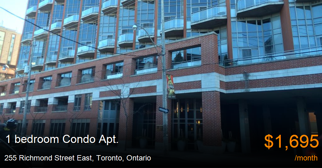 Condo Apt. for rent in Toronto at 255 Richmond Street East. Sun soaked one bedroom lost for rent. Available from April 15th this space is unique and has a two storey window, lovely balcony, close access to transit and the city.