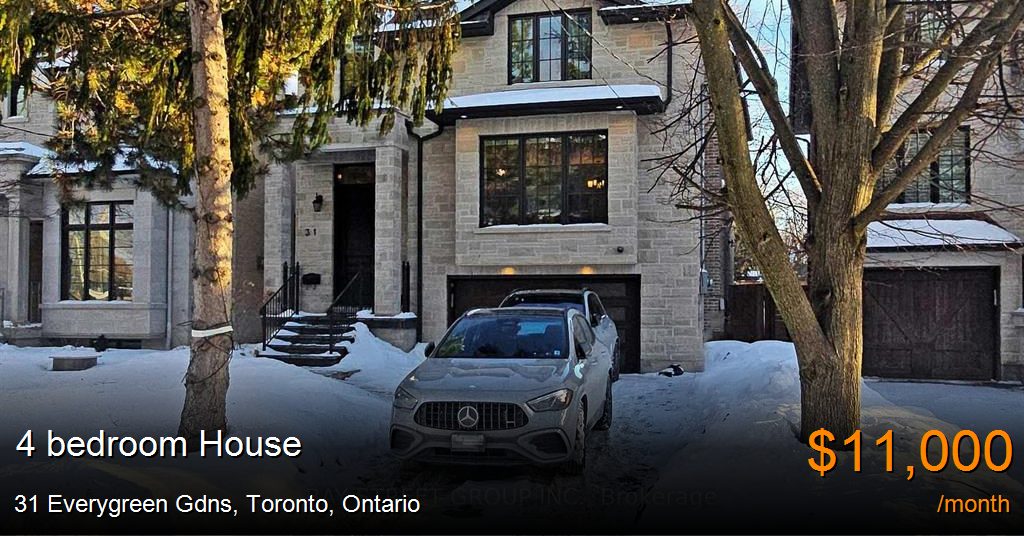House for rent in Toronto at 31 Everygreen Gdns. Located In The Upscale Neighbourhood Of Leaside East York. 5 years brand new entire house. open concept, face south with a lot of sun and bright.Top brand appliances,, gas fireplace, smart toilet, and heated floor in master bedroom .entertaining room in the basement. basement flooring with a water-heated floor, central vacuum, and built-in alarm system . 10 Min To The Downtown Core, Less Than 10 Min Walk To Everything You Need, Restaurants, Groceries, Gym, Transit, Schools, Walking Trails, Dvp. Must See!
