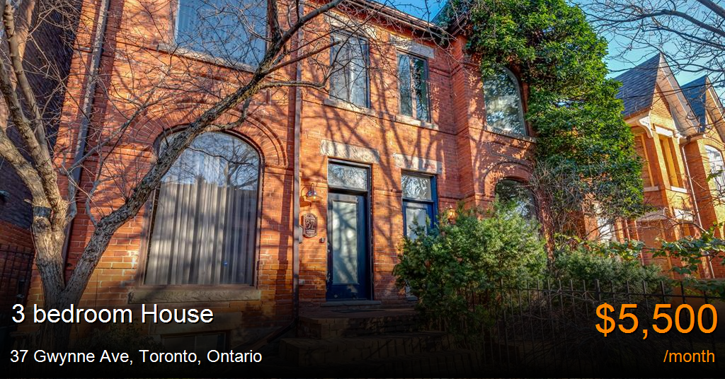 House for rent in Toronto at 37 Gwynne Ave. Truly one of a kind! Move into this incredibly detailed and completely renovated extra-wide Victorian on the impressive tree-lined Gwynne Ave. See how turn of century architecture combines flawlessly with 21st Century amenities. High ceilings, exposed brick, reno'd kitchen & private rear Oasis. Huge luxury spa bath with skylight and unique second bedroom with loft and rooftop balcony! Walk to gym & shops, Drake Hotel, access to streetcar, and Queen W!