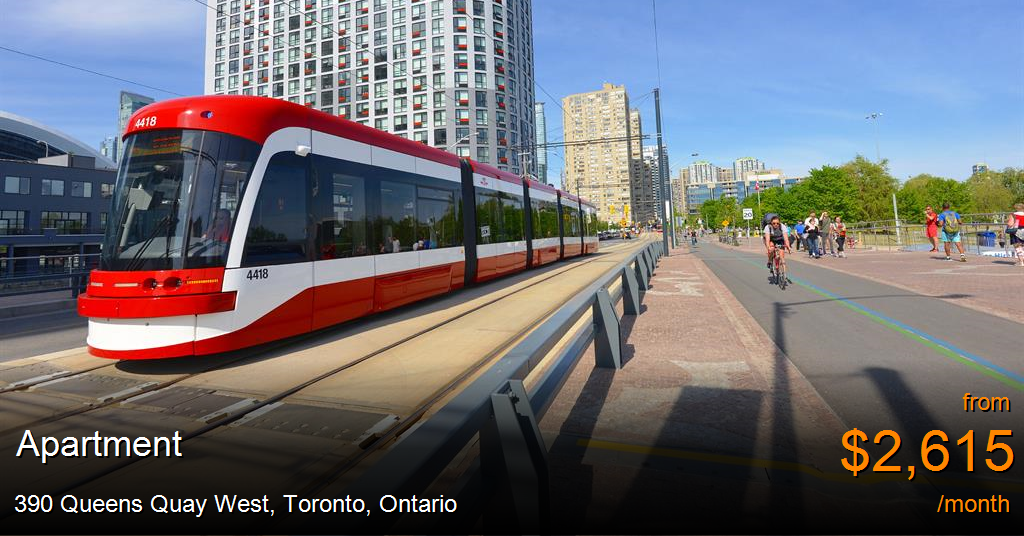Apartment for rent in Toronto at 390 Queens Quay West. Designed for the equal pleasure and convenience of pedestrians, cyclists and drivers, the beautifully renovated Waterfront is fast becoming Toronto's must-live neighbourhood. Just steps from our front door, streetcars run along Queens Quay to Union Station with the subway and GO Transit at your service. The Martin Goodman Trail connects the entire city's waterfront, and we're minutes from CN Tower, Air Canada Centre, Rogers Centre, countless restaurants, clubs, in fact the entire downtown core. Add a beach and the islands, and you have found The Quay to your next apartment. Spacious and newly renovated apartments with breathtaking views of Lake Ontario, Toronto Islands, Billy Bishop airport and the Toronto skyline define The Quay - the only waterfront rental apartment building in Toronto.