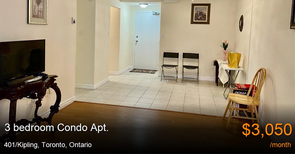 Condo Apt. for rent in Toronto at 401/Kipling. Spacious Corner Apartment in Toronto on the ground floor with a private patio and backyard — enjoy the feel of a home with the convenience of condo living. This bright, open suite includes all utilities and underground parking for $3,050 per month. The building offers 24-hour security with gated entry and surveillance for peace of mind. Located in a prime area with the TTC right at your door, direct bus access to Kipling Subway Station, and walking distance to the GO Train, schools, supermarkets, banks, and plazas. Major highways are just minutes away. No need for elevators — easy move-in like a condo bungalow with your own outdoor space. Available November 1st. 647-367-4237 -Thank you.