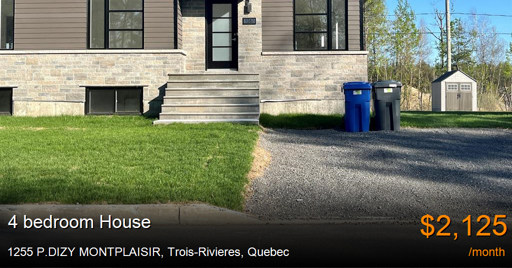 House for rent in Trois-Rivieres at 1265 P.DIZY MONTPLAISIR. Magnifique maison jumelée, récemment construite, située dans un quartier paisible à proximité d'un parc et de toutes les commodités. Ce secteur résidentiel est caractérisé par des rues paisibles et une variété de logements, allant des maisons unifamiliales, maisons de ville aux appartements. Le quartier est bien desservi par les transports en commun et bénéficie de la proximité de divers services.