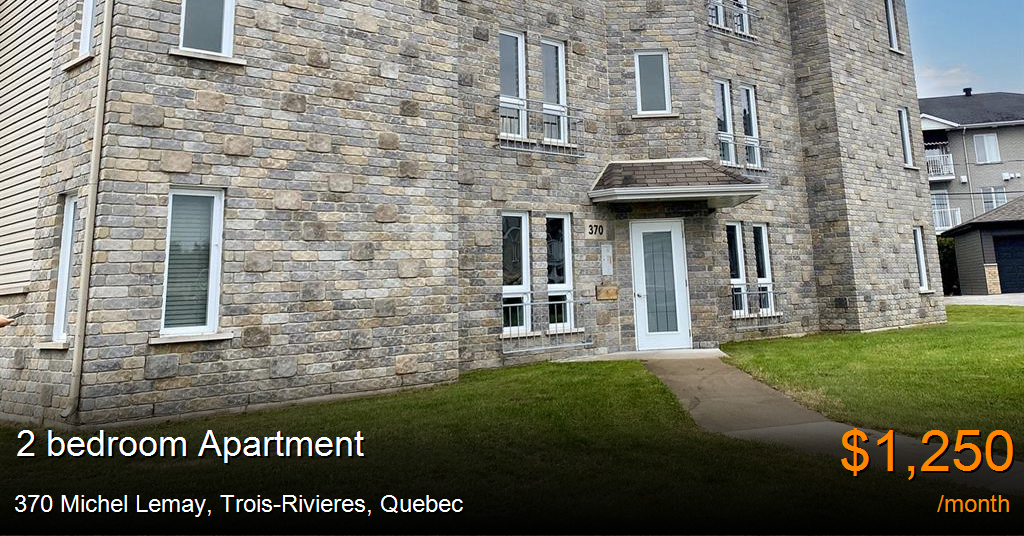 Apartment for rent in Trois-Rivieres at 370 Michel Lemay. Bel immeuble de 6 logements dans un secteur au Cap-de-la-Madeleine à proximité de tout. Ce secteur est très paisible et l'immeuble est dans une rue peu passante. L'immeuble est sur un terrain en coin donnant sur un vaste terrain gazonné.