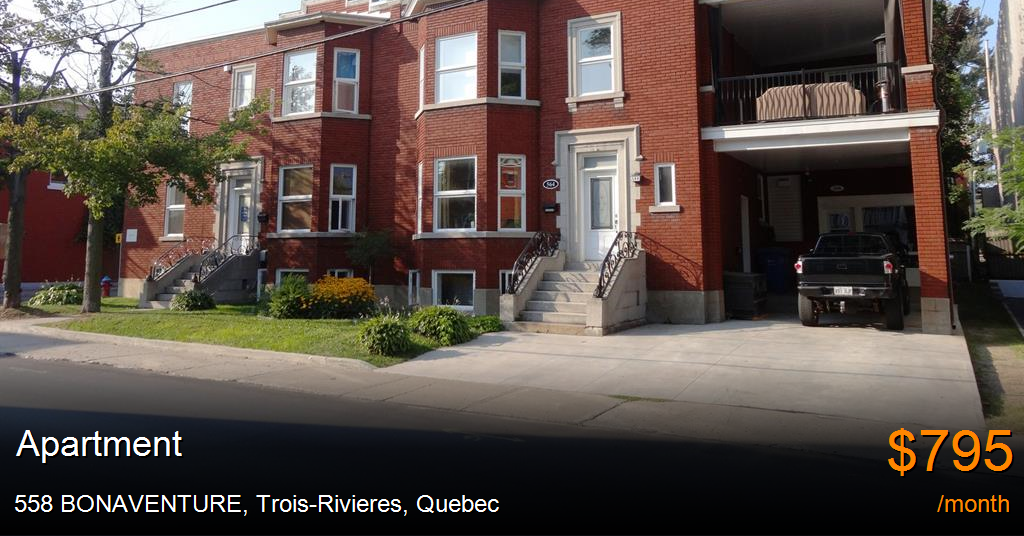 Apartment for rent in Trois-Rivieres at 558 BONAVENTURE. Situé dans le vieux quartier de Trois-Rivières, cet immeuble vous promet un cachet unique où vous retrouverez une bonne fenestration, de grandes pièces, ainsi que de haux plafonds dans la majorité des logements.