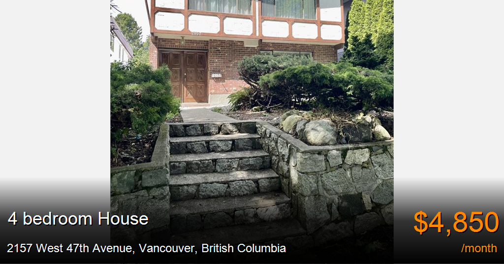 House for rent in Vancouver at 2157 West 47th Avenue. A Classic 1970's Vancouver Special in an excellent quiet location in central Kerrisdale just one block west of West Boulevard on West 47th. Close to West 41st shopping and great schools.So what's so special about a Vancouver Special? It is the perfect, practical family home. At 2532 square feet of usable living space, all above ground, there is no dark dingy basement here. All rooms have big bright windows flooding the house with light. Also, the property has just undergone a total refresh from top to bottom and is ready to move in.The main floor, up a flight of stairs from the entry, features a huge living room with picture windows, vaulted ceiling. Adjacent is a large open dining room. The big family kitchen has an eating area, and provides access to a huge west exposed back deck perfect for barbeques and out door dining. Also on the main floor are two good sized secondary bedrooms, the family bath and a big master bedroom with a half bath en-suite.The garden level of the home offers a huge rec room, office, the fourth bedroom, a full bath with shower stall and plenty of storage space. Also, there is direct access from this level to the attached single care garage with remote controlled overhead door.The low maintenance yard is well landscaped in the front and offers space for a herb garden in the rear.This great family home is available now to a well qualified family with good references. No smoking and no pets please.Address: 2157 West 47th Avenue, VancouverNo smoking and no petsReference and credit check requiredTenant’s insurance requiredAt least one year lease, no short term and no sublettingIf interested, please reply with a brief information on you and your employment, number of people, intend move date etc.