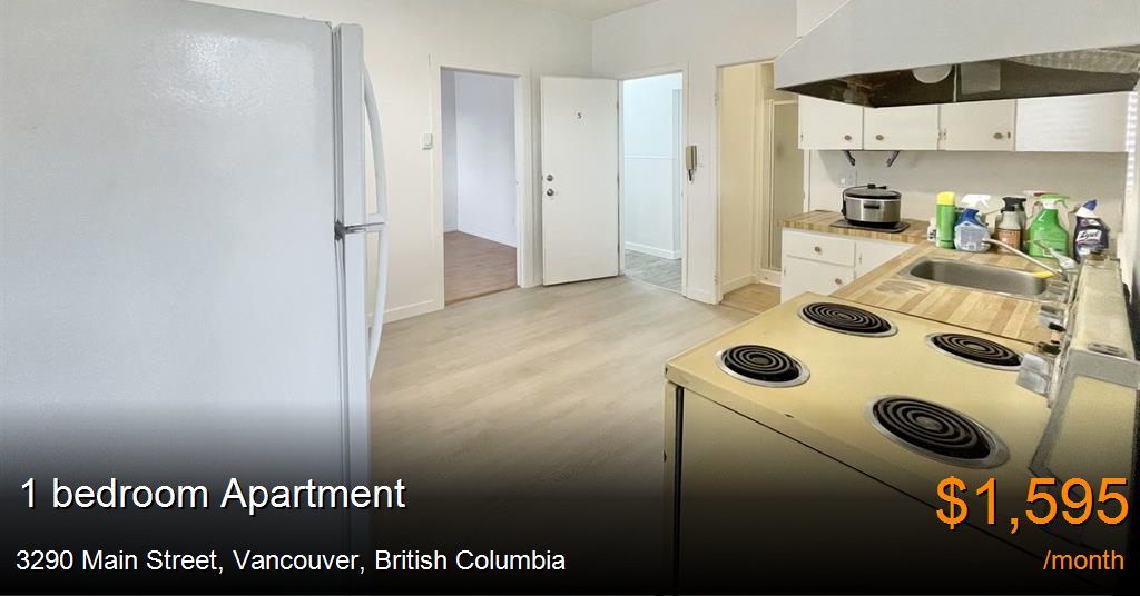 Apartment for rent in Vancouver at 3290 Main Street. If interested, please reply with a brief information on you and your employment, number of people, intend move in date etc.Address: Unit 5 - 3290 Main street, VancouverFreshly painted 1 bedroom unit on the 2nd floor of a well-maintained building in the heart of Mount Pleasant. Recently updated and move-in ready. Perfect for anyone looking for convenience and comfort in one of Vancouver’s most vibrant neighborhoods.? Features:- Open layout with kitchen and living area- Freshly painted, 1 large bright bedroom- New ceiling fan with remote control- Includes fridge and stove/oven- In-suite heating- Quiet second-floor unit- Laundry: No in-suite laundry. Public laundry available just 1 block away.Location:- Prime Main Street location in Mount Pleasant- Bus stop right outside the building- Walking distance to shops, cafés, and restaurants, laundry- Easy access to Downtown VancouverConditions:• No smoking, Pets upon approval• At least 1 year lease, no short term and no subletting• Tenant’s insurance required• Reference and credit check requiredIf interested, please reply with a brief information on you and your employment, number of people, intend move in date etc.This property is professionally managed by Macdonald Commercial Real Estate Services Ltd